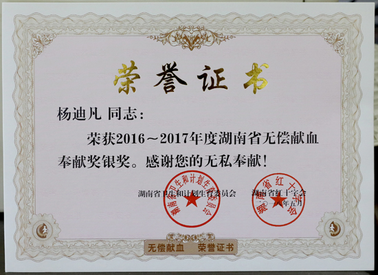 近日,湖南省卫生和计划生育委员会、湖南省红十字会联合发文,对2016-2017年湖南省无偿献血先进单位和先进个人进行表彰。我院职工杨迪凡获得了“湖南省无偿献血奉献银奖”。7月20日下午,杨迪凡收到了湖南省卫生和计划生育委员会和湖南省红十字会颁发的这份沉甸甸荣誉,感到无尚骄傲和自豪。