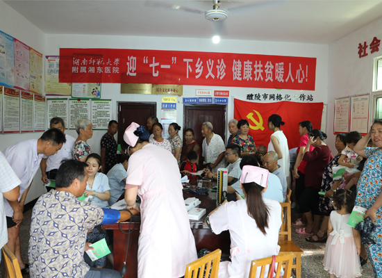 为迎接建党97周年,6月23日上午,我院2018年党员发展对象,入党积极分子组成青年志愿者服务队来到沩山镇青泉村开展以“抓党建促扶贫,服务百姓健康行”为主题的健康扶贫义诊活动,为该村100余名贫困村民送去了免费诊疗和健康体检。