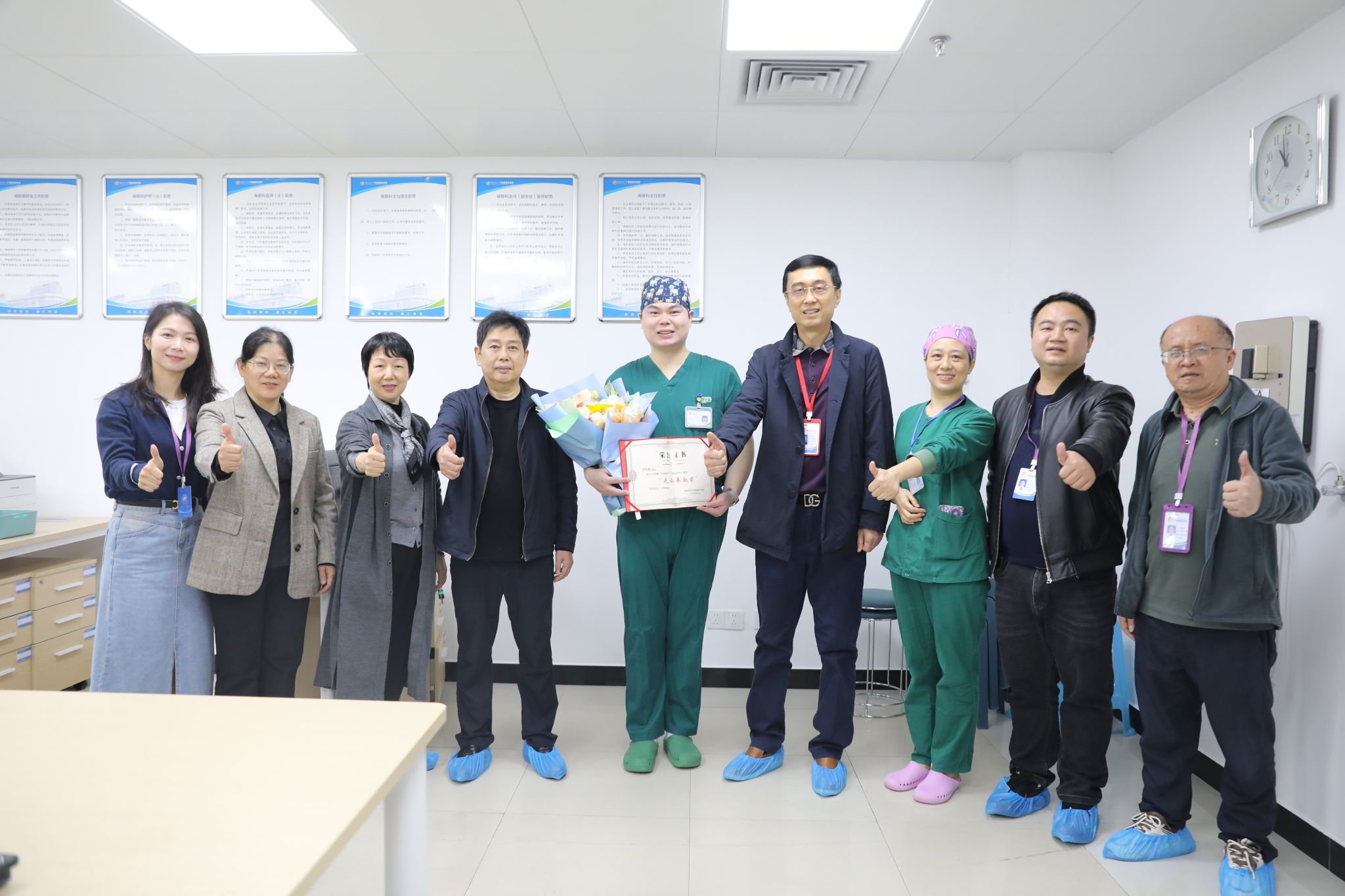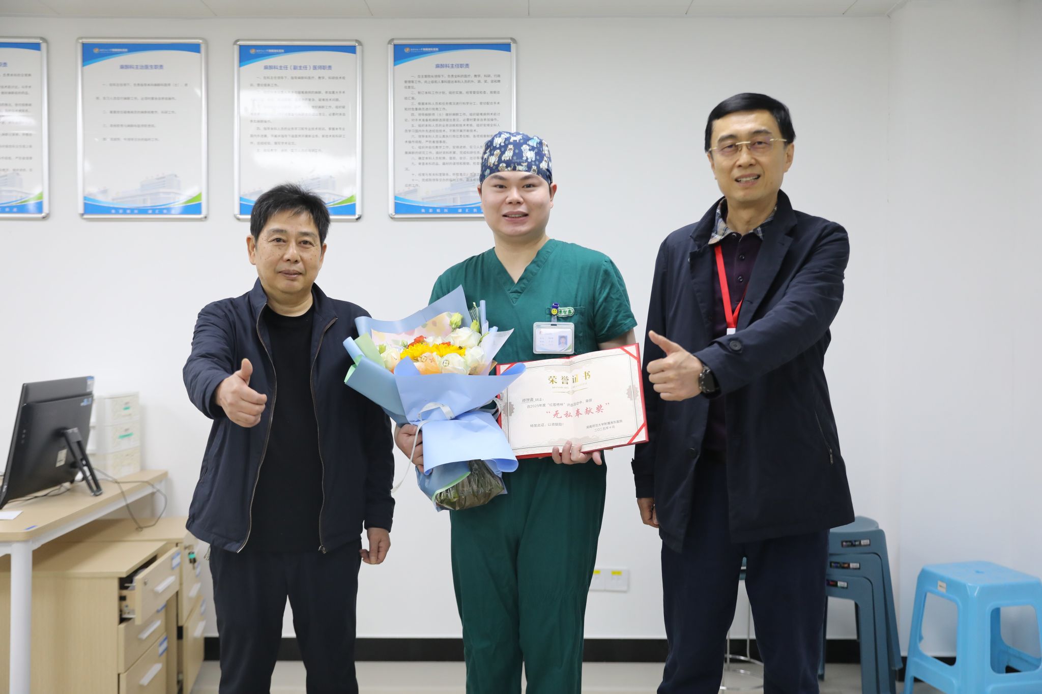 随后,汤建国书记与邹晓院长一同上前,郑重递上“红医榜样证书”与慰问金。红色证书封面熠熠生辉,“红医榜样”四字苍劲有力,既是对谭智鑫两次捐献善举的最高肯定,更是对他以党员身份践行红医精神、坚守医者使命的表彰。董彩梅副院长则捧着娇艳鲜花与精心准备的慰问品走来,花香与暖意交织,让科室里的氛围愈发温馨,也让这份荣誉多了几分动人的温度。