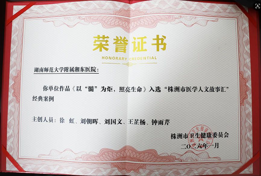 此次作品入围,既是对我院医学人文工作的肯定,更是对赓续红医精神的激励。未来,我院将以此次活动为契机,持续深化红医精神传承,把人文关怀渗透到医疗服务的每一个细节,用有温度的医疗守护群众健康,为株洲卫生健康事业高质量发展注入更多温暖力量。